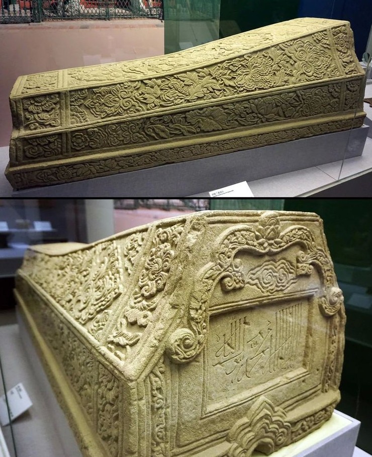 5. Крышка каменного гроба с пионами и исламской надписью. Китай, династия Юань, 1271–1368 гг. н.э.