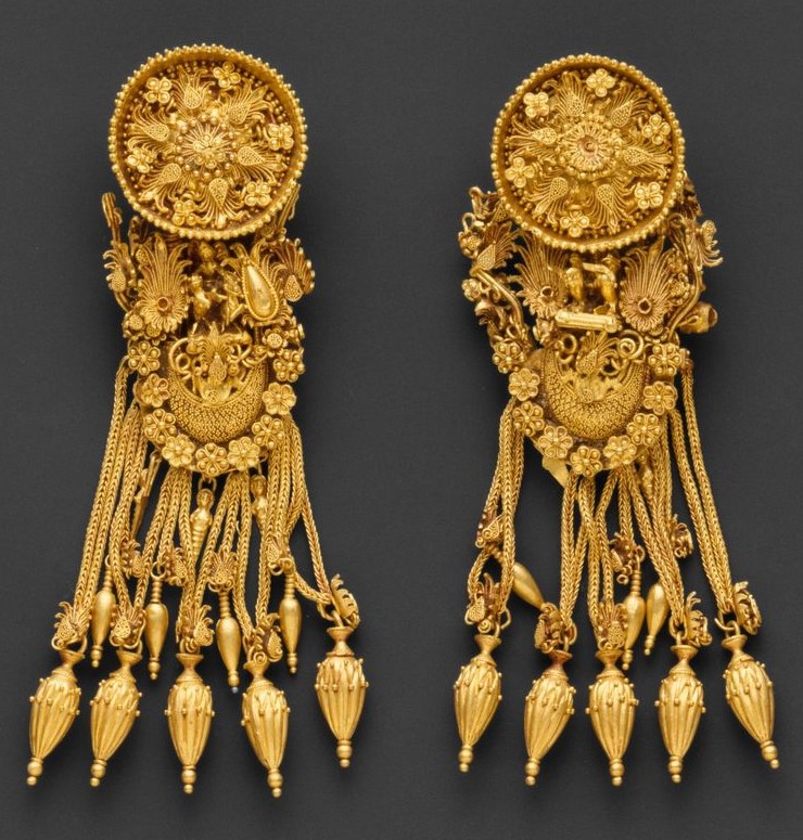 7. Древнегреческие золотые серьги с подвеской в форме диска и лодки, около 300 г. до н.э., в настоящее время хранятся в Метрополитен-музее
