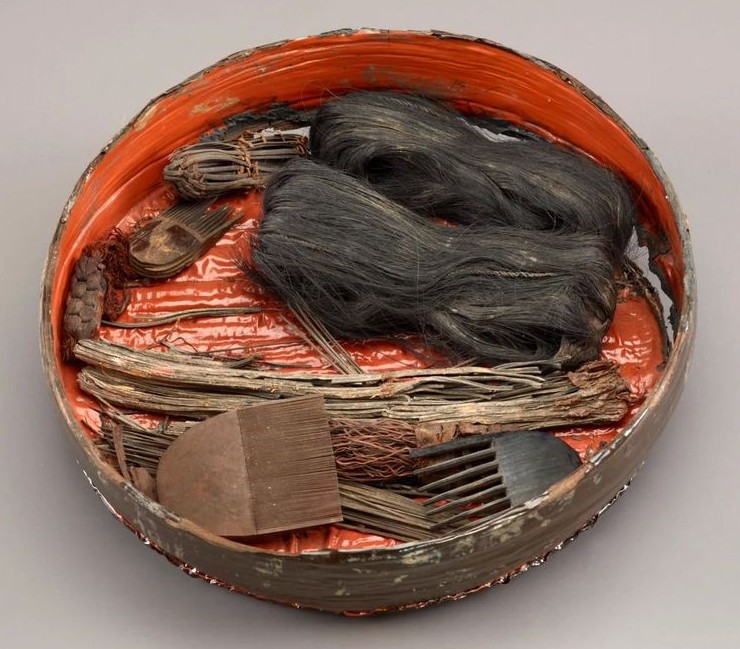 12. Косметическая шкатулка с человеческими волосами, гребнями, щетками, заколками и засушенными цветами. Китай, эпоха Воюющих царств/Династия Западная Хань, III-II век до н.э.