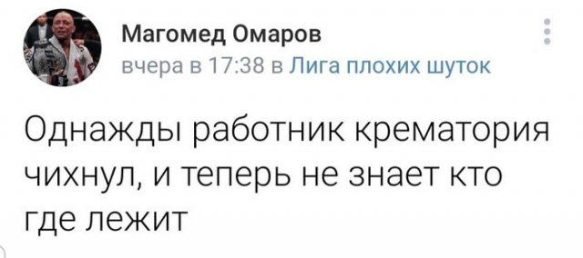 Пользователи социальных сетей продолжают публиковать жесткие и будет специфические шутки на неодинаковые темы. Безусловно, подобные приколы покажутся вдалеке не всем, однако если вы вздыхатель черного юмора - добросердечно пожаловать в продолжение.