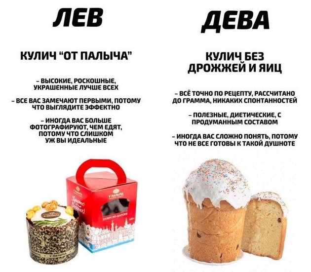 Если вы думали, что астрологи отдыхают на пасхальных выходных (а вы вообще вряд ли об этом думаете), то не тут-то было. Пока все радуются празднику, они выяснили какой вы кулич по знаку зодиака.